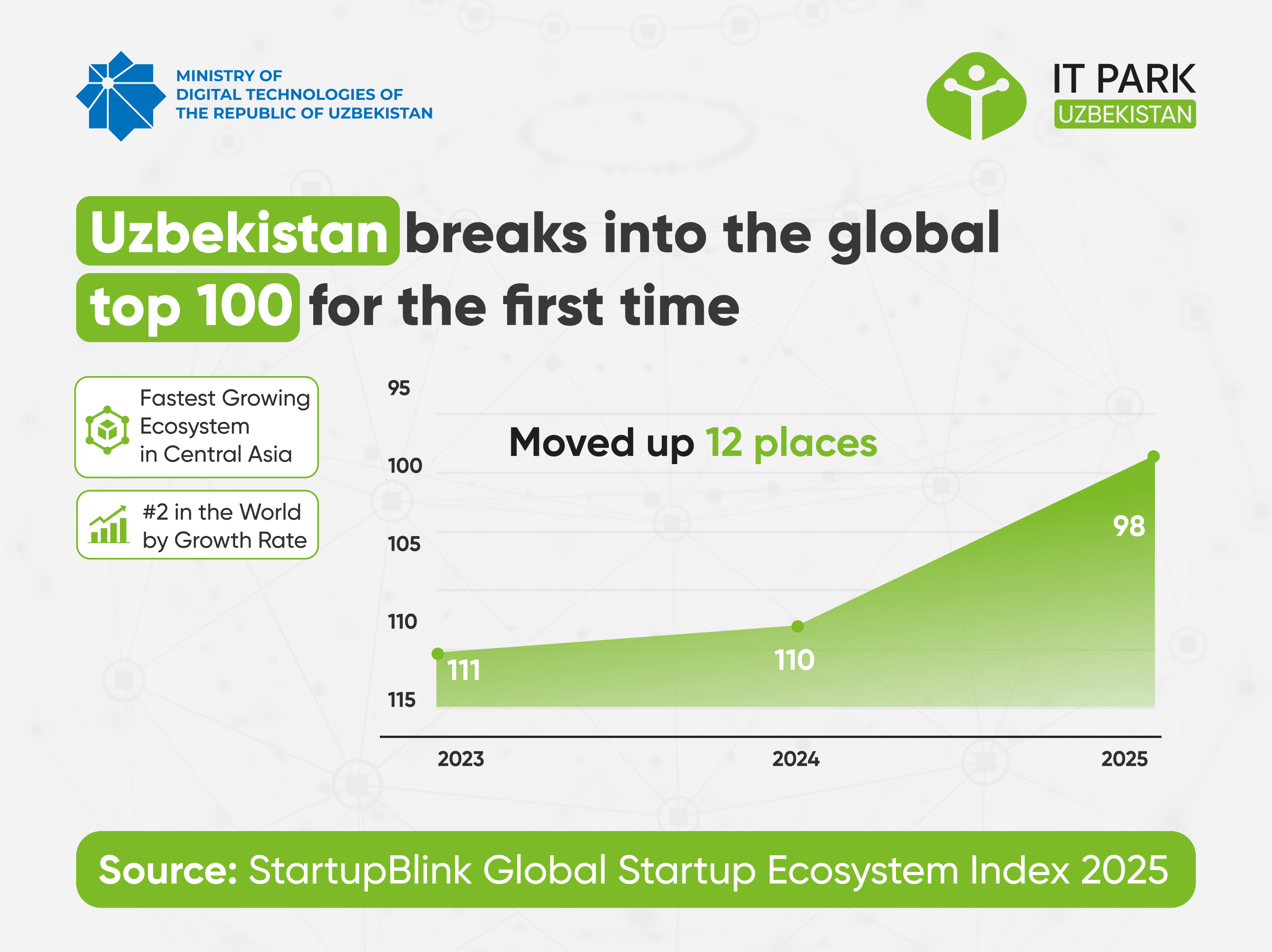 - O‘zbekiston ilk bor global top-100 talikka kirib, dunyoda 98-o‘rinni egalladi. Mamlakat ekotizimi 132 foizdan ortiq o‘sishni qayd etdi, bu esa Markaziy Osiyoda eng yuqori va jahon miqyosida ikkinchi o‘rindagi natija hisoblanadi.